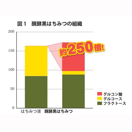 「グルコン酸」とは、ビフィズスの菌の増殖を促進するプレバイオティクス機能を有する物質です。その「グルコン酸」の含有量を、「はちみつ」と「醗酵黒はちみつ」比べてみると約250倍もの差がありました。図1