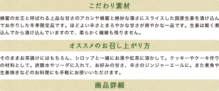 蜂蜜ならではのトロリとしながらもスッキリとした甘さと、生姜の風味豊かなエキスが喉の奥にしみわたります。贈り物にも、ぜひどうぞ。